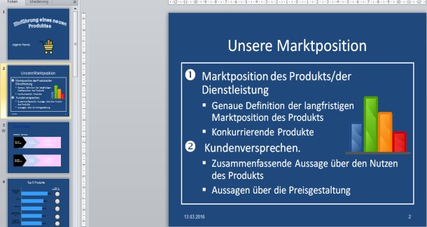 Sie sollten in PowerPoint keine langen Sätze oder ganze Romane schreiben. Verwenden sie lieber Stichpunkte die formatiert als Aufzählung oder Nummerierung ihre Wertigkeit unterstützen. So können Unterpunkte eingerückt oder mit einem anderen Aufzählungszeichen versehen werden. Dadurch ist für den Betrachter sofort zu erkennen welcher Punkt wichtig und welcher untergeordnet ist.